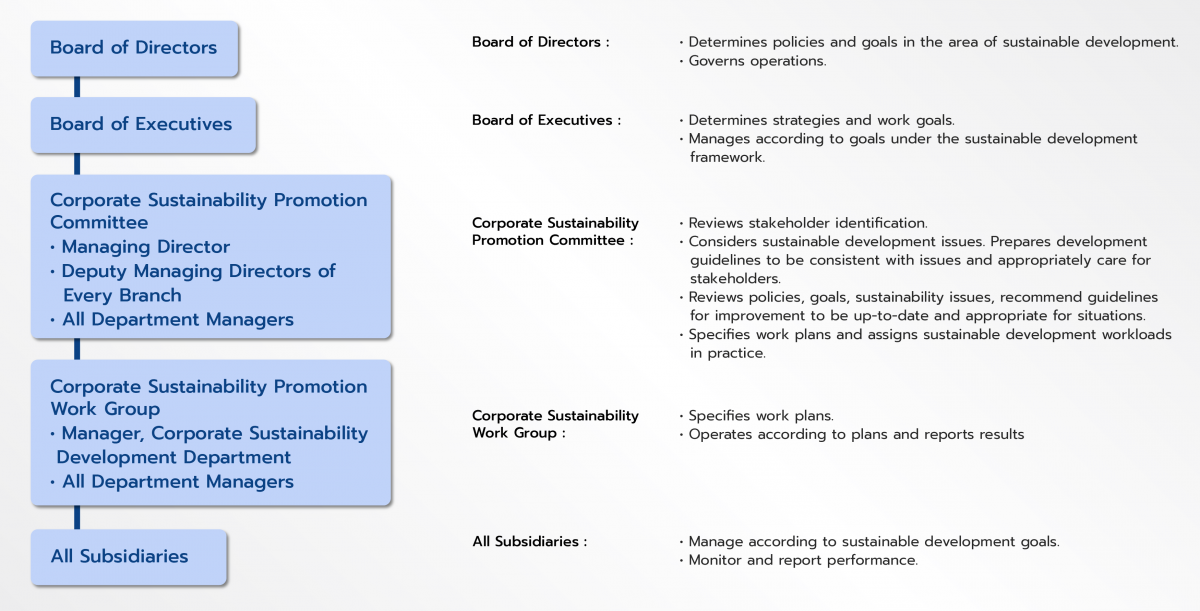 The Company has established the Corporate Sustainability Promotion Committee composed of department managers of various work sections. The Committee is authorized to monitor performance in line with policies and promote activities corresponding with the sustainable management framework and the sustainability equation, “Q+R=S”. Determining the sustainability management framework is an important mechanism for driving internal management at the policy level and the management level in order to lead to practice and project operations in line with the specified framework. The Company will foster beliefs and build understanding for every employee in line with the sustainability equation that doing good work with quality, accuracy and responsibility will build satisfaction for all stakeholders, build strength and sustainability for employees and the organization. The Company has the following sustainability framework and equation: