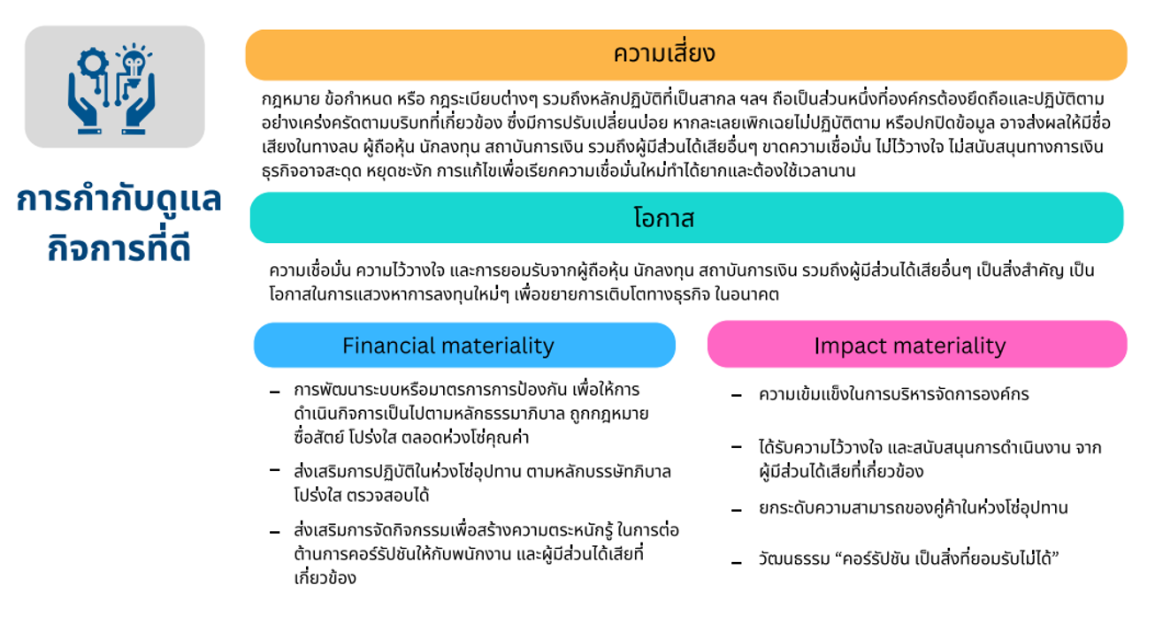 • คำนึงถึงผลกระทบเชิงบวกและเชิงลบต่อผู้มีส่วนได้เสีย เพื่อสร้างความเชื่อมั่นและคุณค่าอย่างยั่งยืน