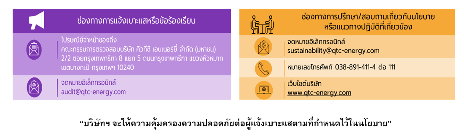 และเพื่อให้มั่นใจว่าบริษัทฯ มีแนวทางปฏิบัติในการต่อต้านคอร์รัปชันที่ดี สามารถตรวจสอบได้ จึงได้จัดทำนโยบายต่อต้านการทุจริตคอร์รัปชั่นไว้เป็นลายลักษณ์อักษร และจัดทำคู่มือแนวทางปฏิบัติที่เกี่ยวข้องไว้เพื่อเป็นแนวทางให้บุคลากรทุกระดับในการกำกับดูแลของ ”คิวทีซี” ยึดถือเป็นบรรทัดฐานการปฏิบัติงาน ซึ่งเป็นส่วนหนึ่งของจรรยาบรรณธุรกิจ โดยมุ่งมั่นที่จะสร้างให้เป็นส่วนหนึ่งของวัฒนธรรมและค่านิยมขององค์กร “การทุจริตคอร์รัปชั่น เป็นสิ่งที่ยอมรับไม่ได้”