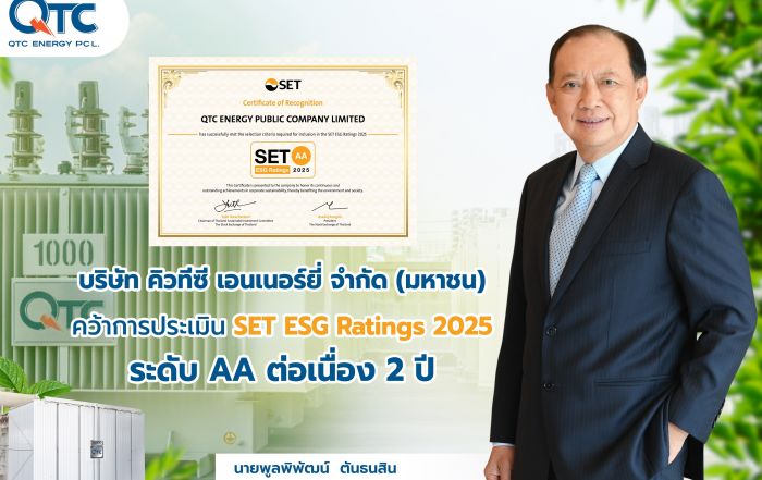 QTC คว้าหุ้นยั่งยืน SET ESG Ratings ระดับ “AA” ต่อเนื่องปีที่ 2 นายพูลพิพัฒน์ ตันธนสิน ประธานเจ้าหน้าที่บริหาร บริษัท คิวทีซี เอนเนอร์ยี่ จำกัด (มหาชน) หรือ QTC เปิดเผยว่า บริษัทฯ ได้รับการประเมิน “หุ้นยั่งยืน” SET ESG Ratings ประจำปี 2025 ที่ระดับคะแนน AA ต่อเนื่องเป็นปีที่ 2 จากตลาดหลักทรัพย์แห่งประเทศไทย สะท้อนถึงความมุ่งมั่นของ QTC [...]